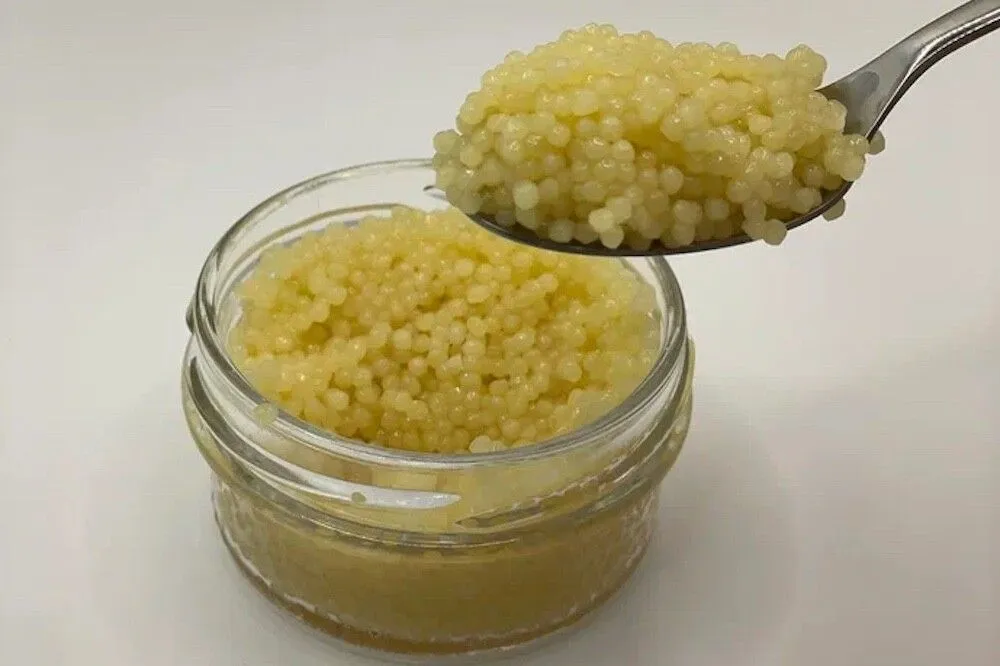 Вторым вариантом является структурированная икра. По составу она ближе к натуральной, так как за основу берется икорный сок — джус, из него изготавливают продукцию, а оболочку воссоздают с помощью желирующих компонентов.