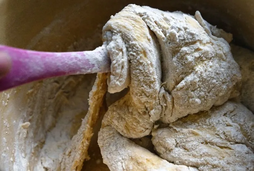 Месить тесто около 10 минут — сначала в миске, затем на столе — пока оно не перестанет липнуть.